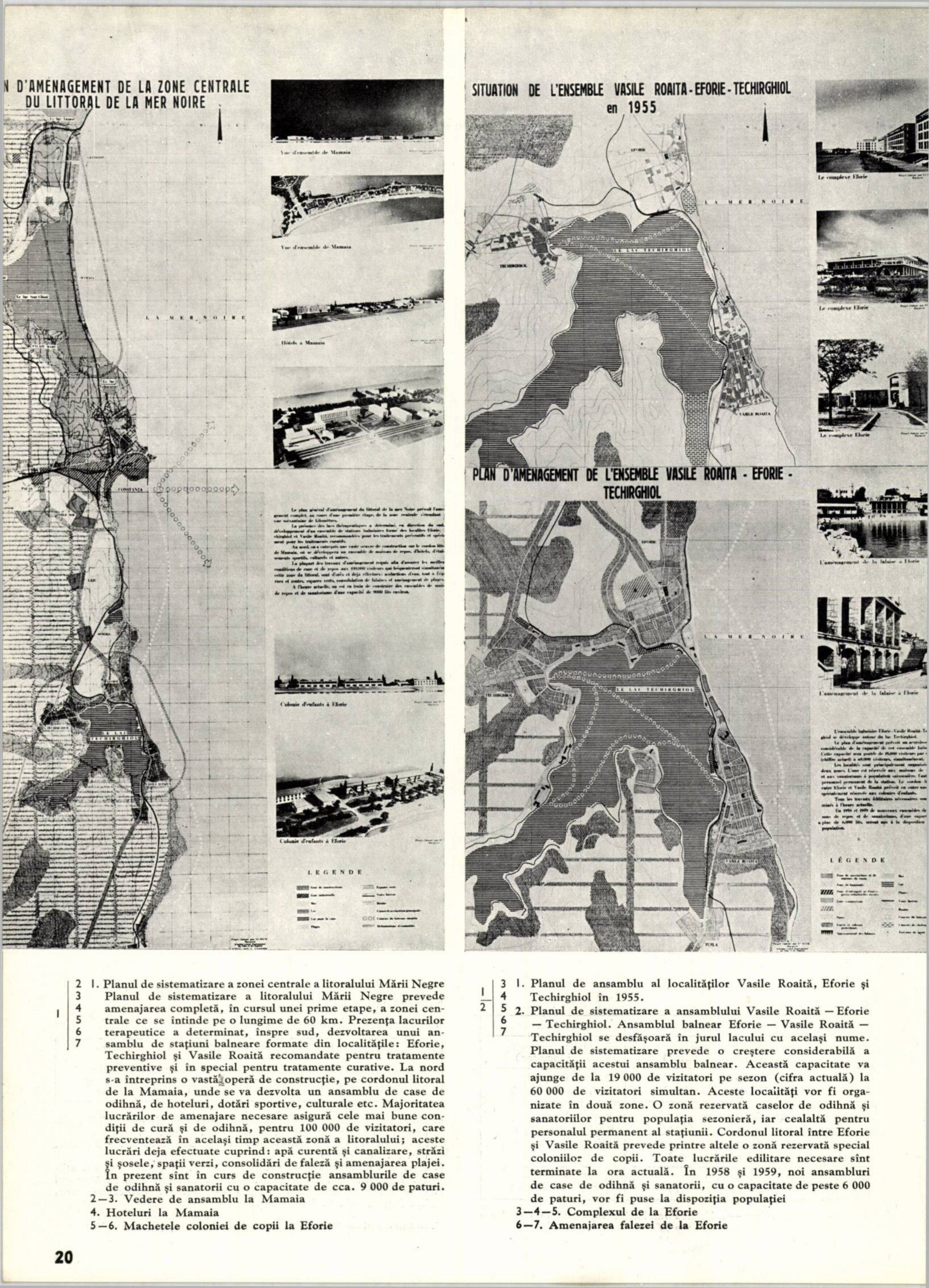 Extrase din panourile de prezentare la congresul internațional U.I.A. de la Moscova, 1958: planul de sistematizare pentru zona centrală a litoralului românesc inițiat în 1955, alături de ilustrarea de hoteluri, colonii copii, dotări publice în fază de proiect. Sursa: „Al V-lea congres al Uniunii Internaționale a Arhitecților”, Arhitectura, nr. 7, 1958, p. 20