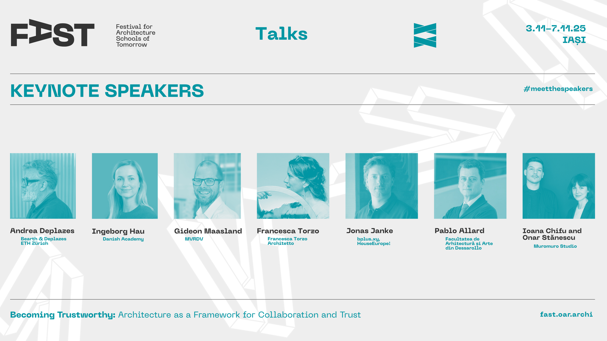 KEYNOTE TALKS @Teatrul Național ieșean, 4-5-6 noiembrie, cu nume de relevanță mondială pentru practica, cercetarea sau educația de specialitate precum Andrea Deplazes (Elveția), Pablo Allard (Chile), Jonas Janke (Germania), Francesca Torzo (Italia), Gideon Maasland (MVRDV). Detalii despre invitați și programul dezbterilor, pe fast.oar.archi. Locurile sunt limitate. Deschidem chiar astăzi, la ora 18:00, înregistrarea gratuită pentru cele trei zile de TALKS de la Teatru! Link-urile de înregistrare sunt următoarele: 4 noiembrie 2025 , 5 noiembrie 2025, 6 noiembrie 2025